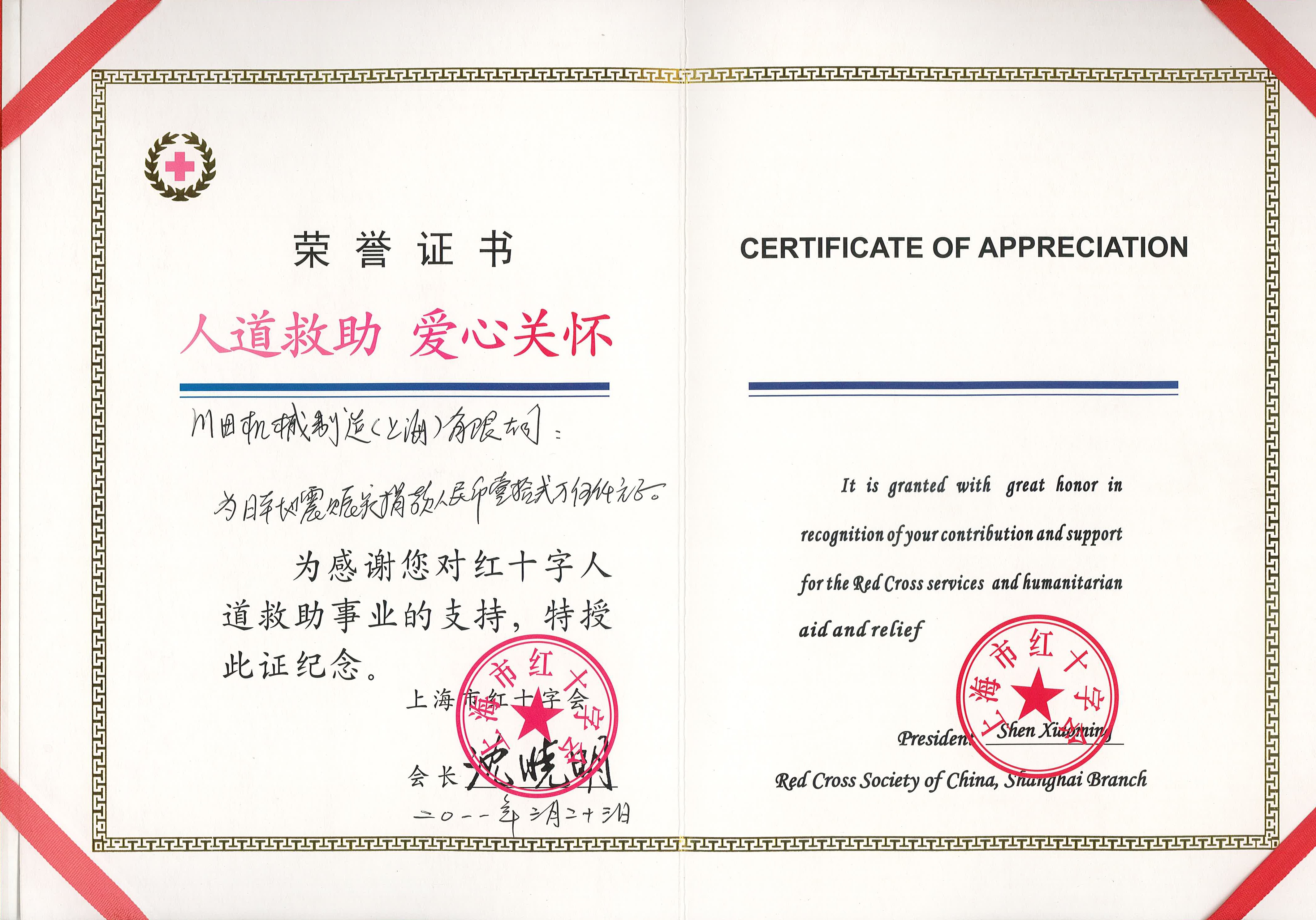 2011年度上海市赤十字栄譽(yù)証書