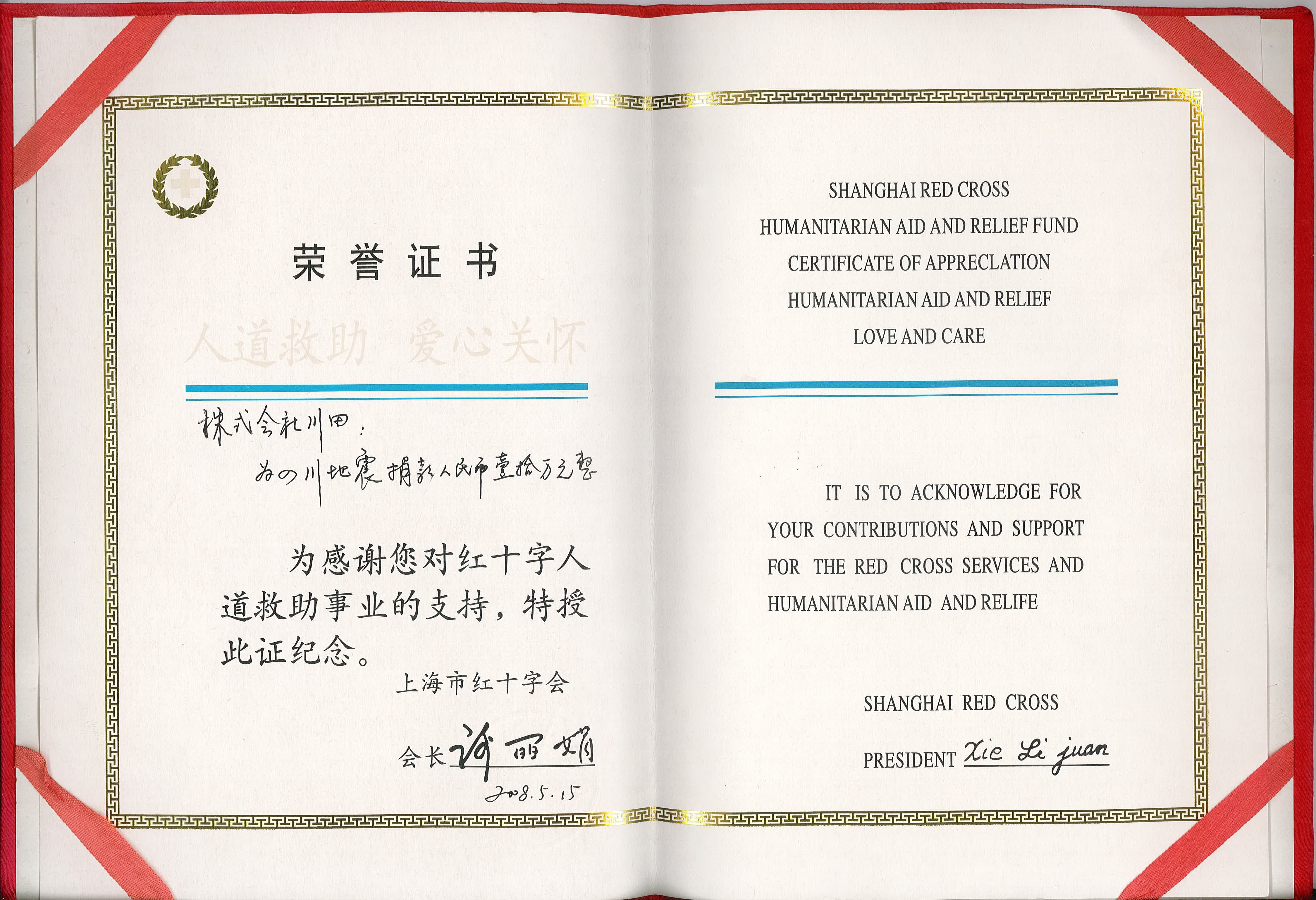 2008年度上海市赤十字栄譽(yù)証書-川田株式會(huì)社